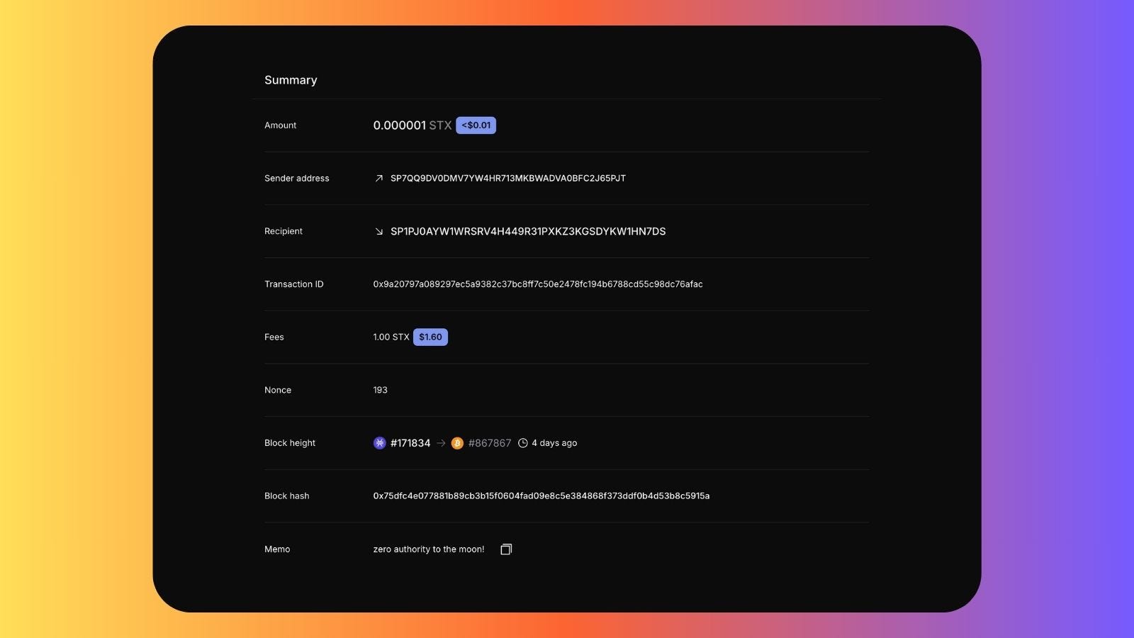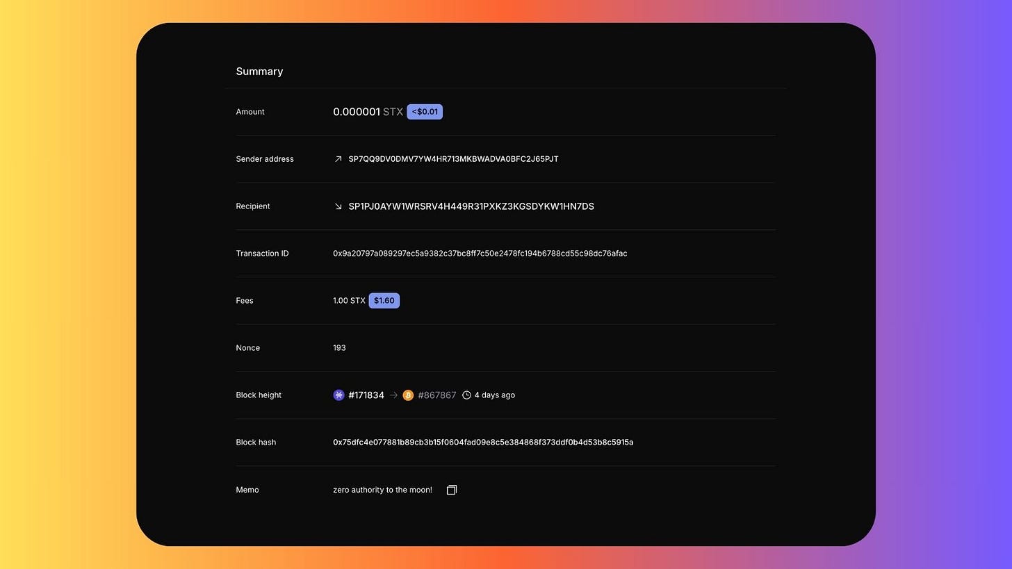 To wrap up this incredible day, I sent @hodlstx a special message on Stacks block 171834, anchored to Bitcoin block 867867. This transaction will live forever, allowing me to look back and share this moment with my children. It’s a reminder of the journey we’re on and the impact we’re making.